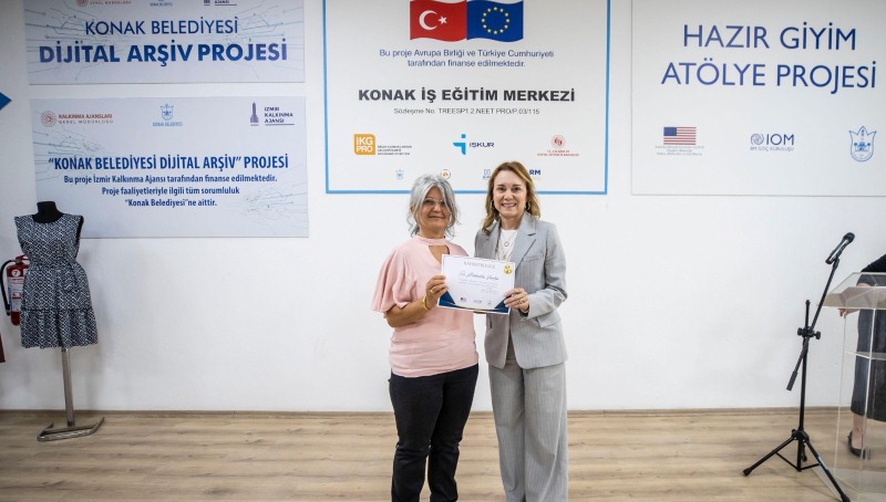 Konak Belediyesi’nin Toros Sosyal Tesisi bünyesinde faaliyet gösteren Hazır Giyim Atölyesi Projesi’nin ilk kursiyerlerinin sertifika töreni Konak Belediye Başkanı Nilüfer Çınarlı Mutlu’nun katılımıyla gerçekleşti. Atölye fuayesinde yapılan törene Başkan Mutlu’yla birlikte Uluslararası Göç Örgütü (IOM) İzmir Ofisi Müdürü Pınar Genç Akçakaya, sponsor firmalardan Ege Deniz Tekstil A.Ş İnsan Kaynakları yöneticisi Selim Pilavcı ve Moda Tekstil Konfeksiyoncular (MTK) site Müdürü Sabahattin Özusta, atölye eğitmenleri, kursiyerler ve bölge muhtarları katıldı. ABD Dışişleri Bakanlığı Nüfus, Mülteciler ve Göç Bürosu tarafından finanse edilen ve Konak Belediyesi ve Uluslararası Göç Örgütü (IOM) işbirliğinde yürütülen Konak Hazır Giyim Atölyesi Projesi kapsamında 32 kursiyer başarıyla mezun olarak sertifikalarını aldı.