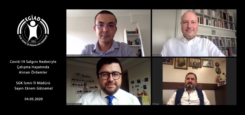Bu süreçte birçok kuruluş, cafe, restoran, gece kulüpleri, sinema ve tiyatrolar kapatılırken camilerde cemaatle kılınan namazlar bakanlığın almış olduğu kararla geçici bir süreliğine durduruldu. Ayrıca birçok kurum salgının daha fazla yayılmasını önlemek amacıyla evden çalışma düzenine geçti. Koronavirüs salgını, tüm dünyada ve TÜİK verilerine göre yaklaşık 28 milyon istihdamın bulunduğu Türkiye’de işverenlerin de temel endişesi haline gelmiş durumda. Konuyu ayrıntılı bir şekilde değerlendirmek amacında olan EGİAD Ege Genç İş İnsanları Derneği “Çalışma Hayatında Alınan Önlemler” konulu bir Webinar gerçekleştirerek, detaylı bilgi almak üzere SGK İzmir İl Müdürü Ekrem Gülcemal’i online konuk etti.