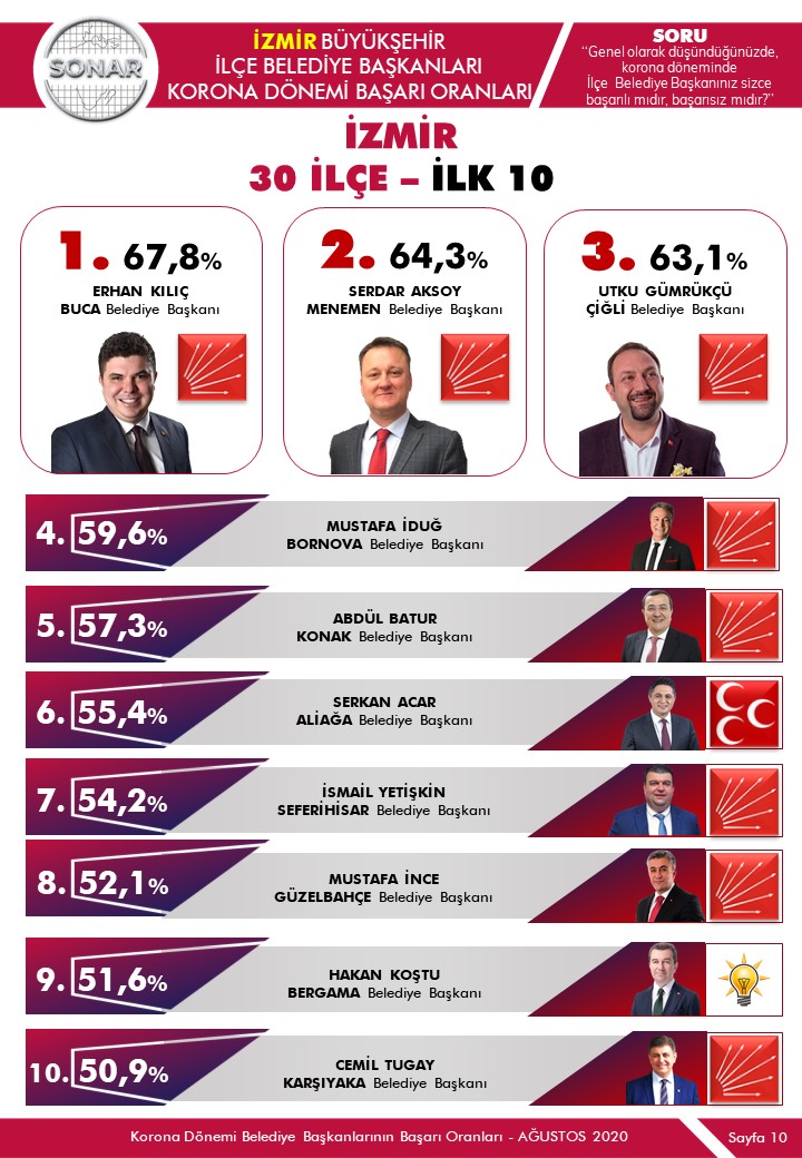 İzmir genelinde 30 ilçe belediye başkanı arasında yapılan araştırmanın Temmuz –Ağustos aylarını kapsadığını belirten Sonar Araştırma Şirketi yetkilileri, vatandaşlara “ Genel olarak düşündüğünüzde pandemi döneminde ilçe belediye başkanınız sizce başarılı mıdır, başarısız mıdır?” sorusunun yöneltildiğini açıkladı. Pandemi döneminde ilçelerinde uyguladıkları çalışmalar ve vatandaşların memnuniyeti ekseninde gerçekleştirilen araştırma, farklı sosyo ekonomik ve sosyo demografik gruba mensup kişilerle gerçekleştirildi. Anket çalışması kapsamında Buca Belediye Başkanı Av. Erhan Kılıç, yüzde 67,8 başarı oranıyla pandemi döneminin en başarı belediye başkanı olurken onu Menemen ve Çiğli Belediye Başkanları takip etti.