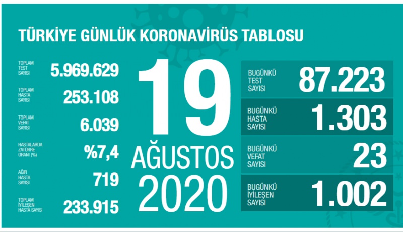 Sağlık Bakanlığının internet sitesinde yer alan ve Bakan Fahrettin Koca'nın da Twitter'dan paylaştığı 19 Ağustos 2020 'Türkiye Günlük Koronavirüs Tablosu'nun güncel verilerine göre; 87 bin 223 yeni test yapıldı, 1303 kişiye yeni tip koronavirüs (Kovid-19) tanısı konuldu. Son 24 saatte 23 hasta vefat etti, 1002 kişi iyileşti.