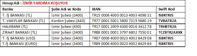 “İzmir Yardıma Koşuyor” kampanyası kapsamında nakdi yardım yapmak isteyen vatandaşlar, aşağıda belirtilen banka ve hesap numaralarını kullanabilecek.