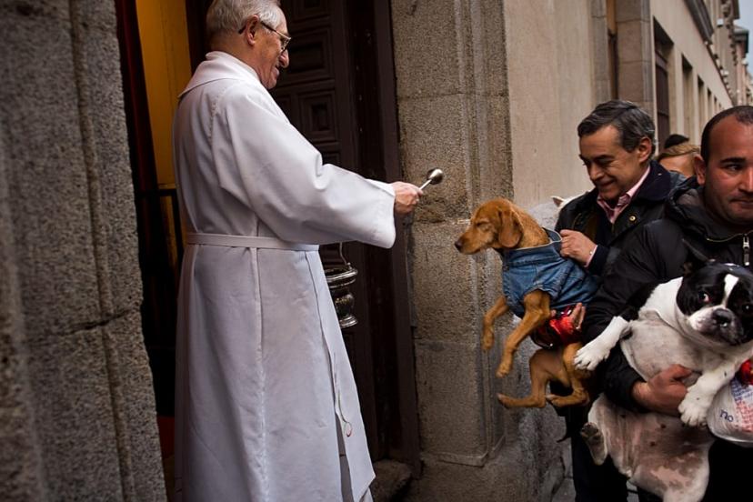 Tören, Madrid’in merkezindeki Aziz Antuan Kilisesi’nin dış basamaklarında yapıldı; köpekler ve kediler üzerlerine kutsal su serpilmesini sabırla bekledi.