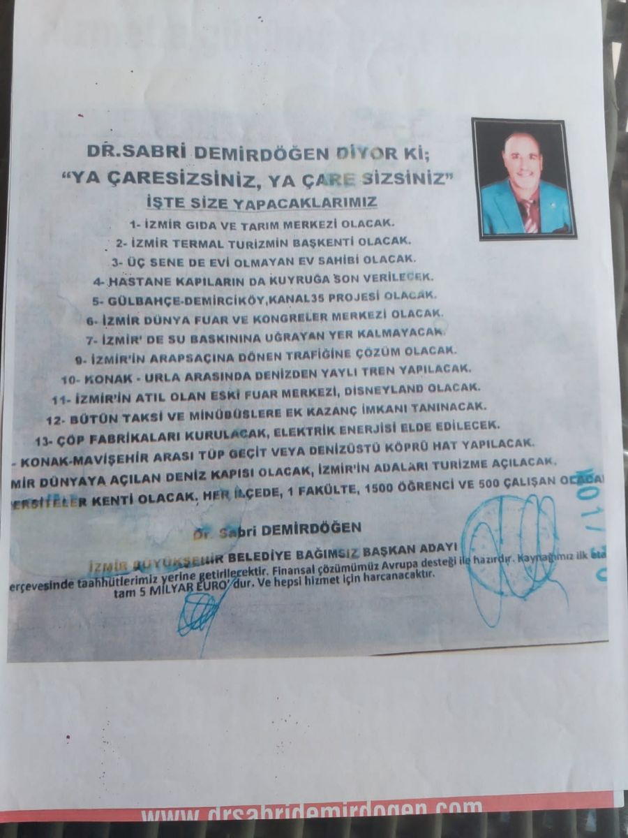 Sekiz yüzden fazla filmin yapımcılığına imza atan Dr. Sabri Demirdöğen İzmir büyükşehir Belediye Başkanı seçilirsem bugüne kadar yaptığım bütün tecrübelerimi ve eforumu sonuna kadar harcayıp İzmir'i dünya kenti yapacağını taahhüt ediyor..