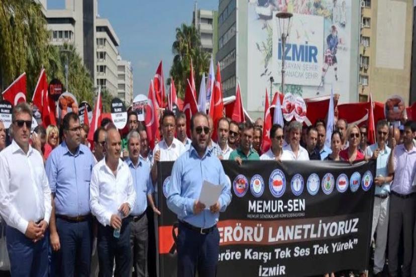 Memur-Sen İzmir Temsilciliği, son dönemde Hakkari ve Iğdır'daki hain saldırılarla artan terör olaylarını lanetlemek için eylem yaptı. Konak Meydanı Hisar Camii önünde bir araya gelen Memur-Sen İzmir temsilcileri, konfederasyona bağlı sendika yetkilileri, teşkilat temsilcileri ve üyelerin katıldığı eylemde sık sık "Teröre karşı omuz omuza", "Kahrolsun PKK", "Kardeşliğe uzanan eller kırılsın", "Askere, polise uzanan eller kırılsın" şeklinde sloganlar atıldı. Basın açıklamasını okuyan Memur-Sen İzmir İl Temsilcisi ve Eğitim-Bir-Sen İzmir 1 No'lu Şube Başkanı Ali Musa Bina, terörü lanetleyerek, birlik mesajları verdi, sağduyu çağrısı yaptı. Terörün, kan ve şiddetten beslenen bir insanlık suçu olduğunu belirten Bina, “Bu insanlık suçunu ancak aklı, ruhu ve vicdanı iflas etmiş kişiler ve gruplar işleyebilir. Terörizmin ve teröristlerin hedefi ise insanlıktır, kardeşliğimizdir, milletimizdir, ortak geleceğimizdir, birlikte yaşama irademizdir” dedi.