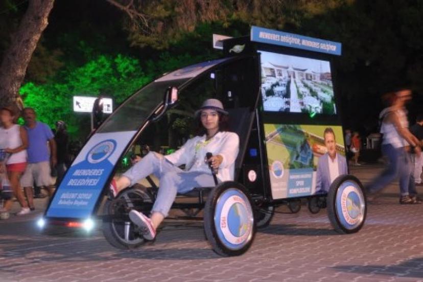 Menderes Belediyesi Basın Yayın Halkla İlişkiler Birimi tarafından ilçe tanıtımı ve belediye hizmetlerinin tanıtımına yönelik hayata geçirilen Bisik-Led uygulaması Menderes’in ardından İzmir Enternasyonal Fuarı’nda ziyaretçilerle buluşuyor. Bisiklet üstüne monte edilen led ekranda, ilçenin ve belediye faaliyetlerinin anlatıldığı uygulama fuaralanının dört bir yanını dolaşıyor.