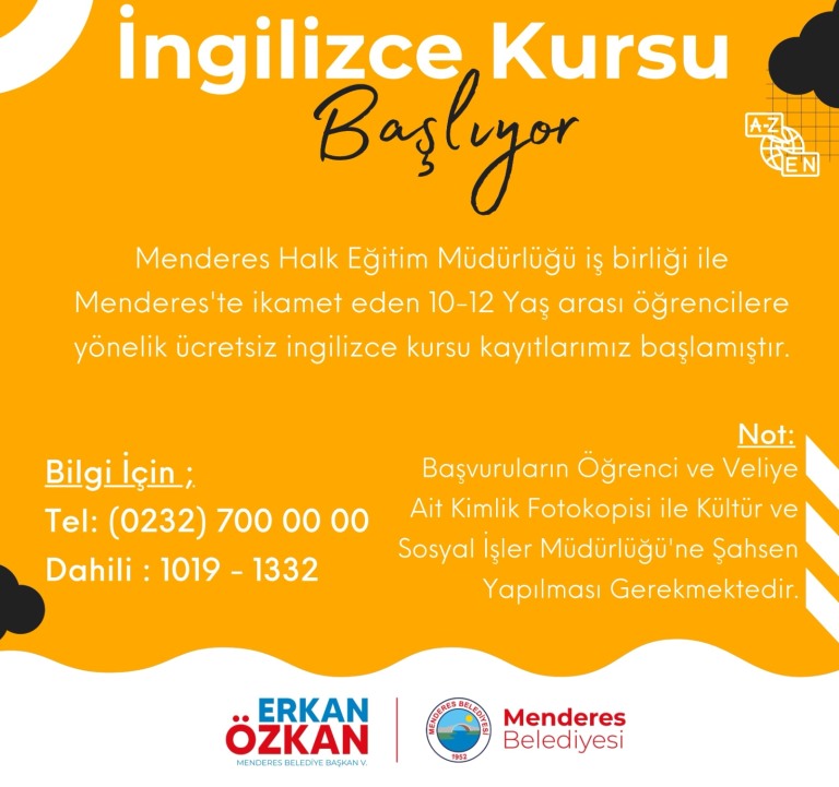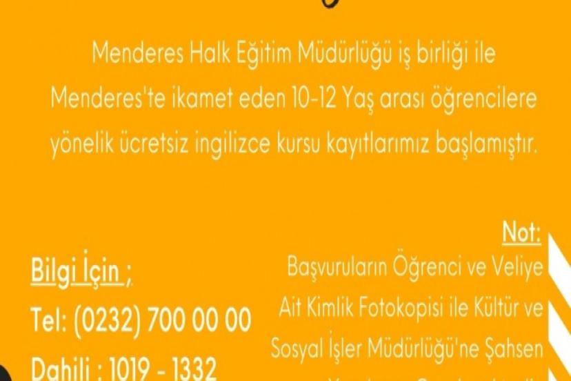 Menderes Belediyesi tarafından başlatılacak ücretsiz İngilizce kursu için kayıtlar alınmaya başlandı. Menderes Belediye Başkan V. Erkan Özkan öğrencileri kurstan yararlanmaya davet etti.