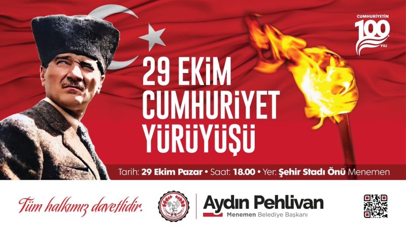 Pehlivan sözlerini şöyle sürdürdü: Ulu Önder Mustafa Kemal Atatürk'ün, bu topraklara en büyük mirası olan Cumhuriyetimizin 100. yıl dönümünü, yurdumuzun dört bir yanında olduğu gibi Menemen'imizde de milletçe bir arada kutlamanın gururu ve heyecanı içindeyiz. Menemen Belediyesi olarak, Gazi Mustafa Kemal Atatürk'ün, "Ey yükselen yeni nesil; Cumhuriyeti biz kurduk, onu yüceltecek ve yaşatacak olan sizlersiniz." sözüne layık olmak için büyük bir kalkınma hamlesi içindeyiz. Eğitim desteklerinden kütüphanelere, bilimde, sanatta, sporda, istihdamda vizyon projelerimizi hızla gerçekleştiriyoruz. Vatanını en çok seven, en çok çalışandır düsturuyla yaptığımız yüz akı projelerimizi şimdi de Cumhuriyetimizin 100. yıl etkinlikleriyle perçinliyoruz. Saat 18:00'da Menemen Stadyumu önünden başlayacak Cumhuriyet Yürüyüşümüz, 19:30'da Cumhuriyet Meydanında Ajda Pekkan konseriyle zirveye ulaşacak. Sizleri 29 Ekim Pazar günü yapacağımız etkinliklere davet ediyor, bu vesileyle 29 Ekim Cumhuriyet Bayramımızı, cumhuriyetimizin 100. yılını en kalbi duygularımla kutluyorum. Milletiyle, devletiyle Yaşasın Türkiye Cumhuriyeti!