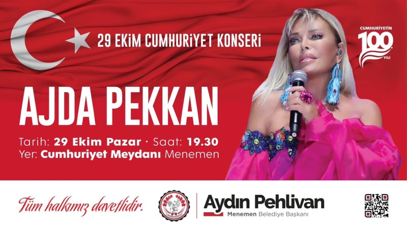 Menemen Belediyesi Cumhuriyetimizin 100. kuruluş yıl dönümünü çok özel etkinliklerle kutlayacak. Etkinliklerin zirve noktası ise Süperstar Ajda Pekkan’ın Menemenliler ile birlikte en güzel şarkılarını Cumhuriyet için söyleyeceği konser olacak. Cumhuriyet kutlamalarına değinen Menemen Belediye Başkan Vekili Aydın Pehlivan, “İlçemiz için yaptığımız yüz akı projeleri yüzüncü yılda unutulmaz bir etkinlikle perçinliyoruz.” dedi.