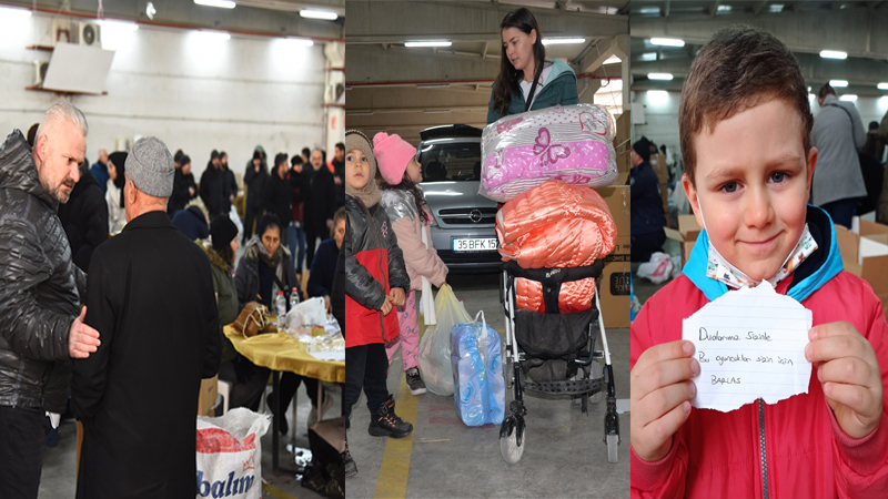 Menemen Belediyesi tarafından yürütülen yardım kampanyasına katılmak üzere Halil Akkaya Pazaryerine gelen Furkan, Yusuf ve isimli iki çocuk, annelerinden kumbaralarındaki paralar ile deprem bölgesinde kardeşlerini sıcak tutacak kıyafetleri gönderirken, Barlas ve Elif isimli iki çocuk ise en sevdiği oyuncakları afetzede kardeşlerine ulaştırmak üzere belediye yetkililerine teslim etti. Çocukların yazdığı duygu dolu mektupları da gören Belediye personeli gözyaşlarını tutamadı.