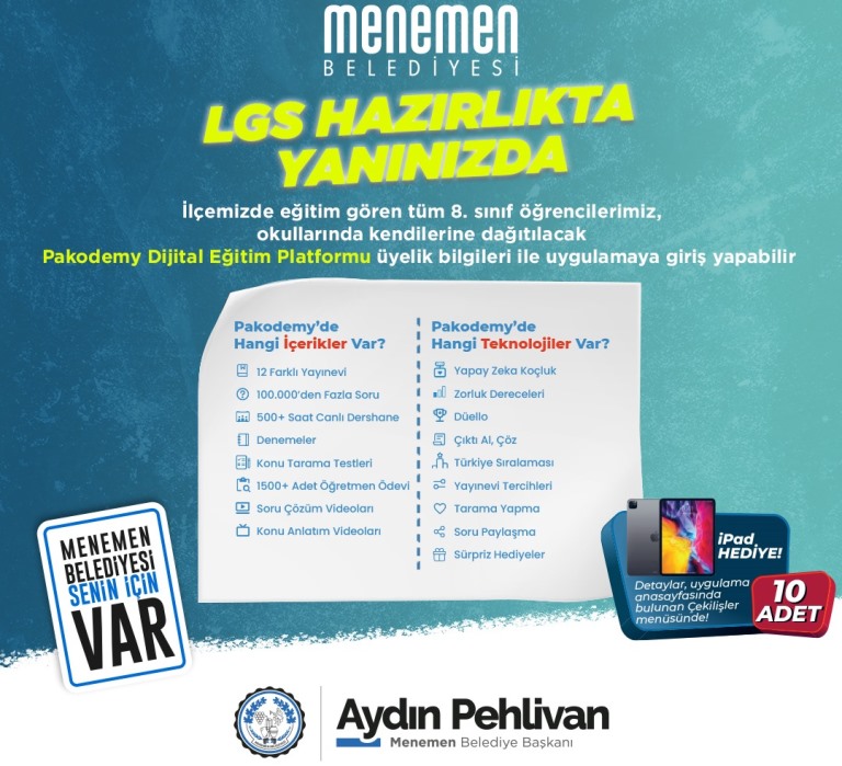 Eğitime yaptığı yatırımlarla dikkat çeken Menemen Belediyesi, öğrenci dostu projelerine bir yenisini daha ekledi. Menemen Belediye Başkan Vekili Aydın Pehlivan, bu yıl Menemen’de Yükseköğretim Kurumları Sınavı’na (YKS) hazırlanan 12. sınıf öğrencilerine ve Liselere Giriş Sınavı’na (LGS) hazırlanan öğrencilere kaynak sağlamak amacıyla ‘Dijital Eğitim Platformu’ desteğinde bulunmaya başladıklarını müjdeledi.