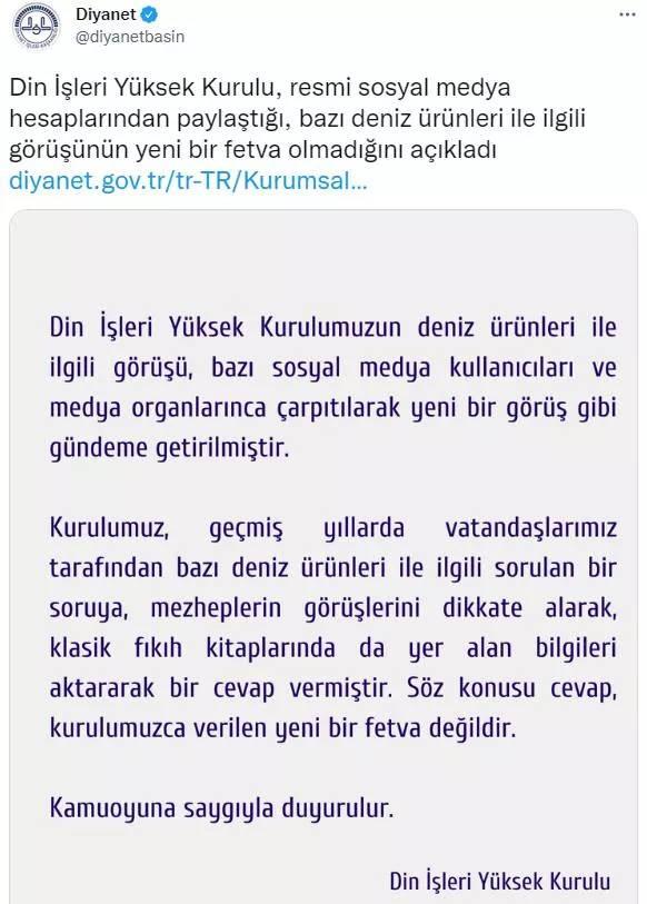 Açıklamada, "Kurulumuz, geçmiş yıllarda vatandaşlarımız tarafından bazı deniz ürünleriyle ilgili sorulan bir soruya mezheplerin görüşlerini dikkate alarak klasik fıkıh kitaplarında da yer alan bilgileri aktararak bir cevap vermiştir. Söz konusu cevap, kurulumuzca verilen yeni bir fetva değildir" ifadeleri kullanıldı.