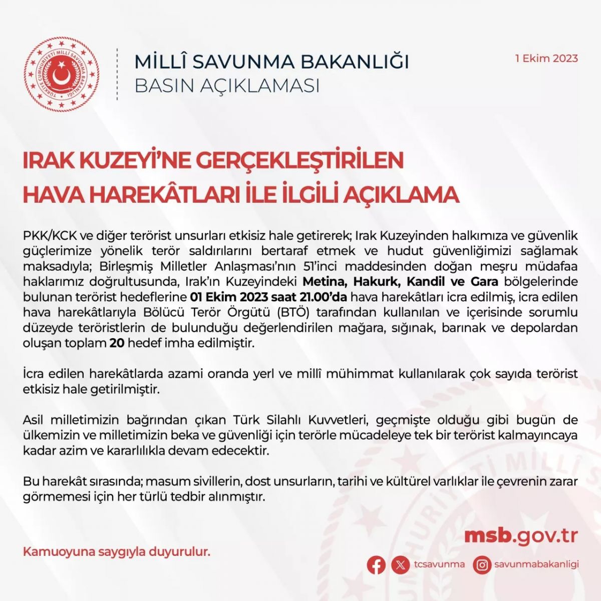 PKK/KCK ve diğer terörist unsurları etkisiz hale getirerek; Irak Kuzeyinden halkımıza ve güvenlik güçlerimize yönelik terör saldırılarını bertaraf etmek ve hudut güvenliğimizi sağlamak maksadıyla; Birleşmiş Milletler Anlaşması'nın 51'inci maddesinden doğan meşru müdafaa haklarımız doğrultusunda, Irak'ın Kuzeyindeki Metina, Hakurk, Kandil ve Gara bölgelerinde bulunan terörist hedeflerine 01 Ekim 2023 saat 21.00'da hava harekâtları icra edilmiş, icra edilen hava harekâtlarıyla Bölücü Terör Örgütü (BTÖ) tarafından kullanılan ve içerisinde sorumlu düzeyde teröristlerin de bulunduğu değerlendirilen mağara, sığınak, barınak ve depolardan oluşan toplam 20 hedef imha edilmiştir.