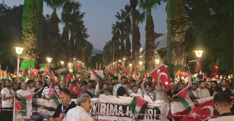 İzmir Fuarı Basmane 9 Eylül Meydanı'nda toplanan binlerce kişi, ellerinde Türk ve Filistin bayraklarıyla, üzerinde İsrail aleyhine ifadelerin yer aldığı döviz ve pankartlarla yürüyüşe geçti.