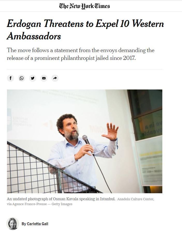 Dışişleri'ne Osman Kavala küstahlığyla başvuruda bulunan 10 ülkenin Büyükelçileri ile ilgili Cumhurbaşkanı Erdoğan diplomatik prosedürlerin başlatılması talimatını verirken, NYT gazetesinde; Bu ülkelerin ardında ABD'nin olduğu yazıldı.
