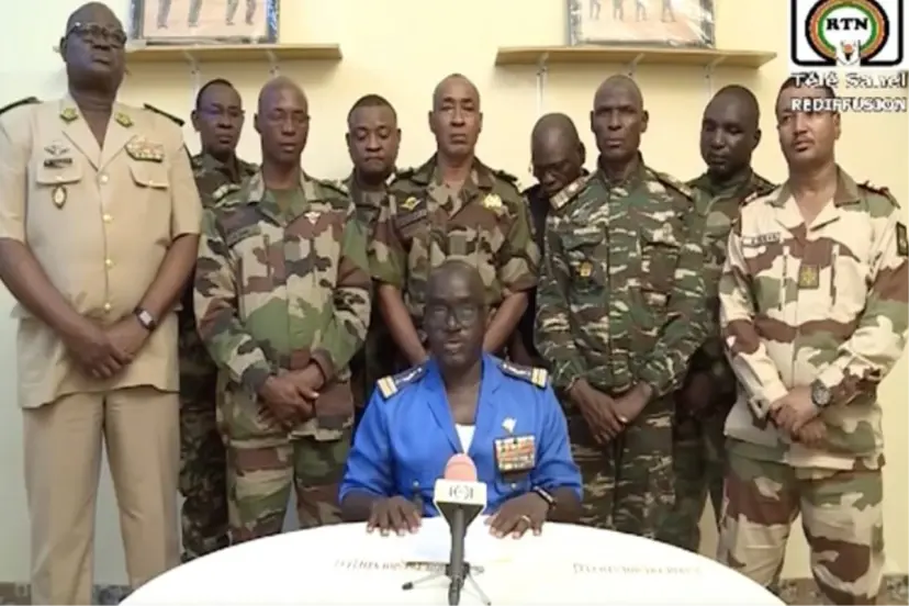 Yarbay Amadou Abdramane'nin okuduğu bildiride, giderek kötüleşen güvenlik durumu ve ülkenin içinden geçtiği sosyo-ekonomik kriz nedeniyle Cumhurbaşkanı Mohamed Bazoum'un devrildiği ve anayasanın askıya alındığı bildirildi. Bildiride, 22.00-05.00 saatlerinde sokağa çıkma yasağı uygulanacağı ve tüm sınırların kapatıldığı kaydedildi.