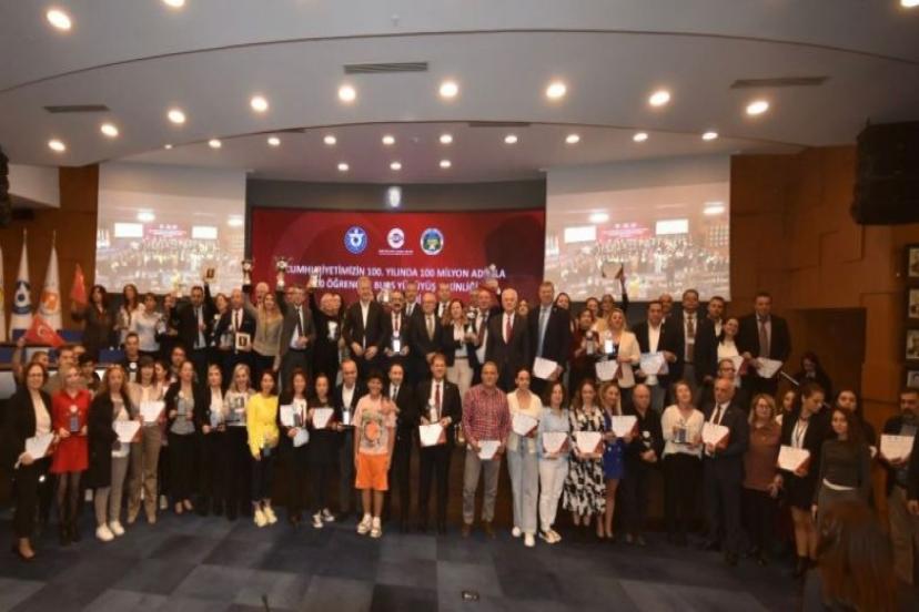 T.C. İzmir Valiliği Cumhuriyetin 100. Yılı Etkinlikleri kapsamında, İzmir Ticaret Odası, Ege Bölgesi Sanayi Odası ve İzmir Ticaret Borsası işbirliğinde düzenlenen “Cumhuriyetimizin 100. Yılında 100 Milyon Adımla 100 Öğrenciye Burs Yürüyüş Etkinliği’nin Ödül Töreni”, İzmir Ticaret Odası (İZTO) Yönetim Kurulu Başkanı Mahmut Özgener, Ege Bölgesi Sanayi Odası (EBSO) Yönetim Kurulu Üyesi Hüseyin Turhan ve İzmir Ticaret Borsası (İTB) Yönetim Kurulu Sayman Üyesi İlhan Zincircioğlu’nun açılış konuşmalarıyla başladı.