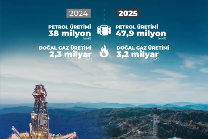 Enerji ve Tabii Kaynaklar Bakanlığı, 2024'te yıllık 38 milyon varil olan yurt içi petrol üretiminin 2025 yılında yüzde 26 artış ile 47,9 milyon varile, doğal gazda ise 2024'te yıllık 2,3 milyar metreküplük Türkiye geneli üretimin 2025'te yüzde 39 artarak 3,2 milyar metreküpe çıktığını duyurdu.