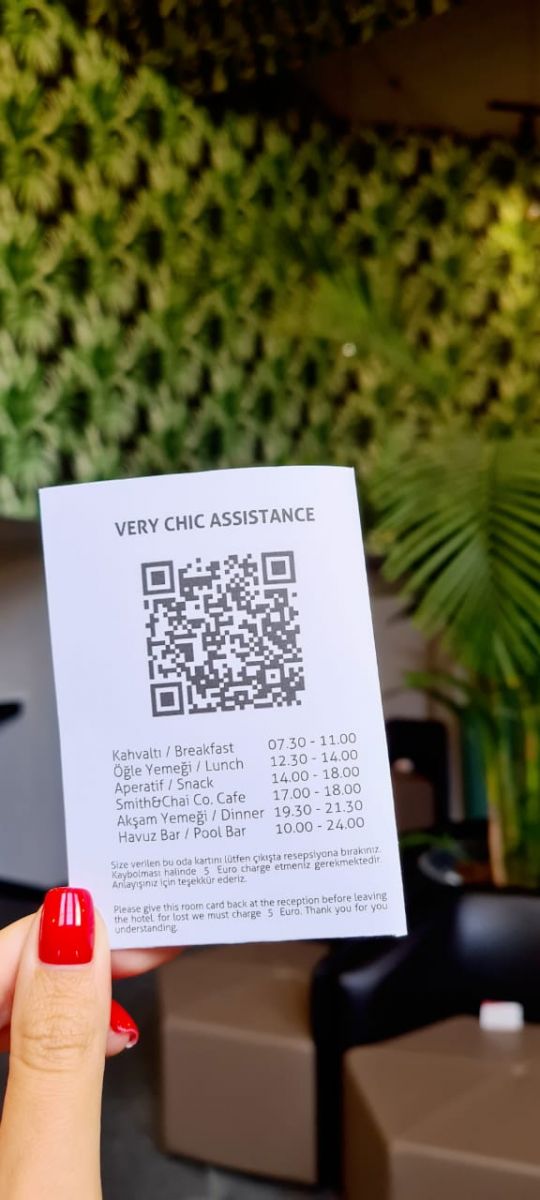 İlk giriş yaptıkları andan itibaren bilgilendirilen misafirler odalarındaki QR kodlarla otelin uygulamasına yönlendiriliyor. Oda içerisindeki taleplerinden, akşam ne yiyeceklerinin belirlenmesi kadar tüm hizmeti uygulama üzerinden alabiliyor. Yani misafirler hangi gün hangi öğünde ne yiyeceğini ve içeceğini odasındayken sipariş edebiliyor.