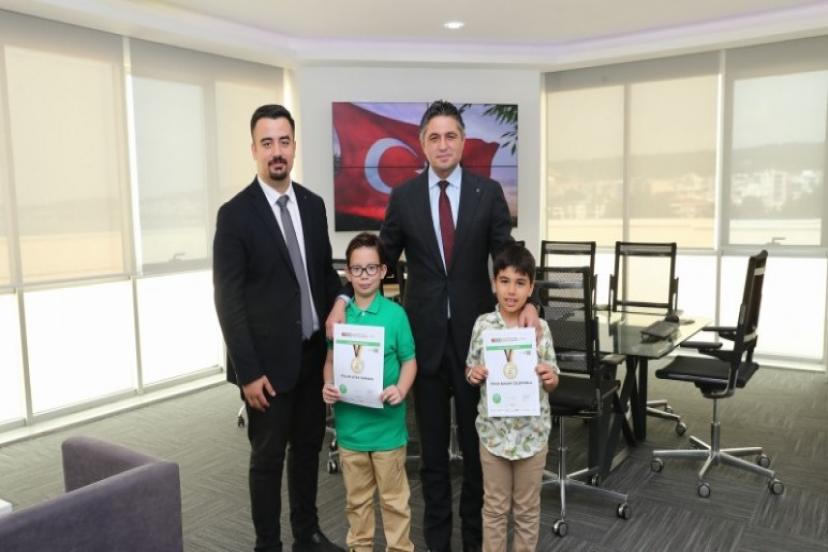 Aliağa Belediye Başkanı Serkan Acar, ‘Uluslararası STEM Olimpiyatları’nda kodlama kategorisinde 3.sınıflar düzeyinde dünya birincisi olan Aslan Ateş Sarıbaş ile 2.sınıflar düzeyinde dünya üçüncüsü olan Fevzi Başar Celepoğlu’nu makamında misafir etti.