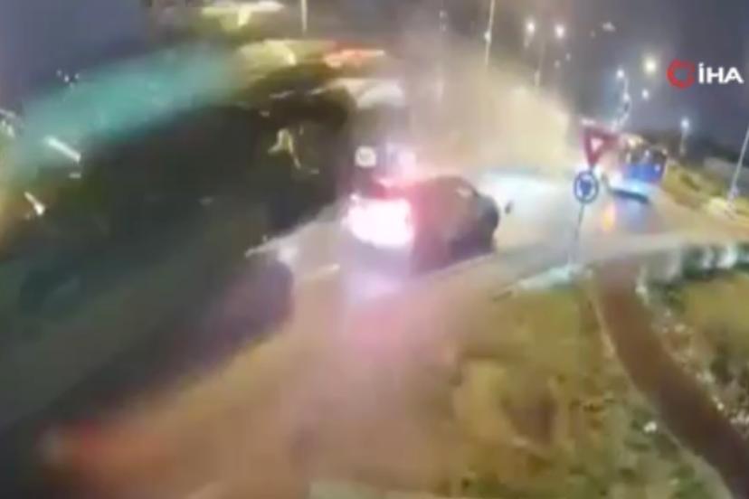 Romanya'nın Oradea kentinde kavşağa çarparak havalanan aracın karşı şeritteki 2 aracın üzerinden uçtuğu anlar, güvenlik kamerasına anbean yansıdı.