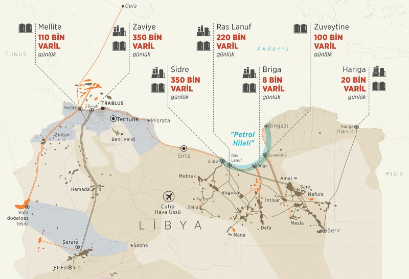 Libya Dışişleri Bakanlığı, ülkenin doğusundaki gayrimeşru güçlerin lideri Halife Hafter saflarında savaşan "terör ve suç unsurlarının" bölgesel ve uluslararası güvenliği tehdit ettiğini belirtti. Libya'da petrol üretim tesislerinin kapalı kalmasından dolayı toplam kaybın 5 milyar 269 milyon dolar olduğu tahmin ediliyor.