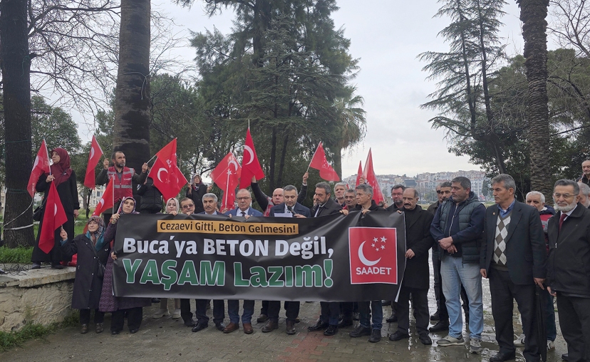 “Cezaevi gitti, beton gelmesin! Buca’ya beton değil, yaşam lazım!” yazılı pankart eşliğinde Buca eski Cezaevi alanı önünde toplanan Saadet Partili grup, cezaevinin kaldırılmasıyla ilçede yeni bir çevre ve ulaşım düzeni oluşturma fırsatı doğduğunu; ancak alınan imar kararıyla bu fırsatın heba edildiğini dile getirdi.