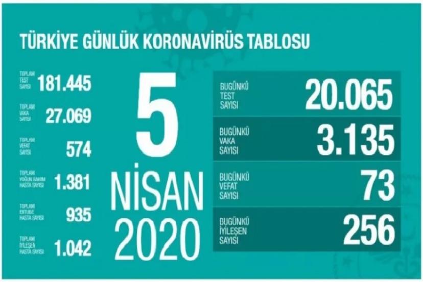 Corona virüsle mücadelede son rakamlar şeffaf bir biçimde Sağlık Bakanı Fahrettin Koca tarafından kamuoyuna duyuruluyor. Öte yandan Sağlık bakanlığı da özel olarak hazırlanan siteden yeni nesil korona virüs - Covid-19 vakalarını tablolar eşliğinde yayınlıyor. Bugün 05 Nisan 2020 itibariyle son vakalar, test sayısı ve hayatını kaybedenlerin sayısı açıklandı.
