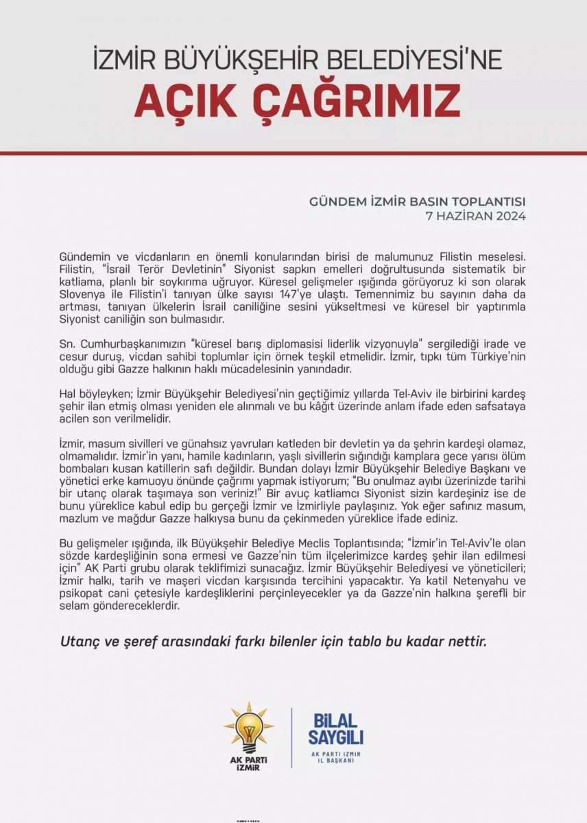 AK Parti İzmir İl Başkanı Bilal Saygılı, partisinin il binasında düzenlediği basın toplantısında, İzmir Büyükşehir Belediye Meclisi'nde İzmir ile Tel-Aviv arasındaki "kardeş şehir" kararının kaldırılması ve Gazze'nin tüm ilçelerce "kardeş şehir" ilan edilmesi için AK Parti grubu olarak teklif sunacaklarını açıkladı. Saygılı, İsrail'in Gazze'deki eylemlerine tepki göstererek, İzmir'in Gazze halkının yanında olduğunu vurguladı.