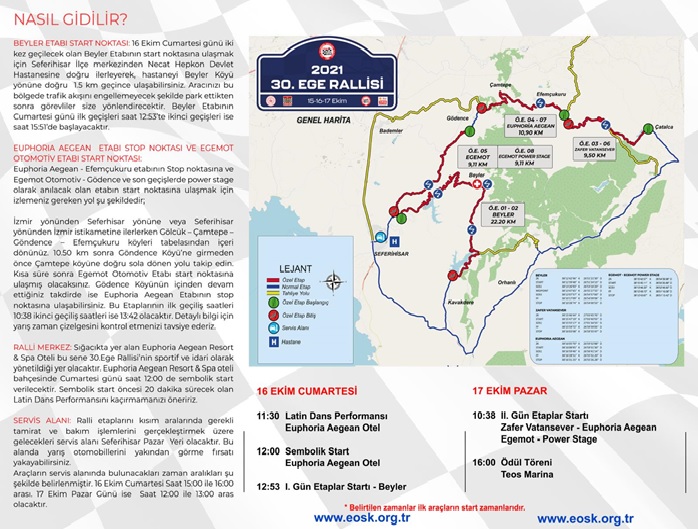 Sponsor kuruluşlar arasında yer alan Euphoria Hotels & Resorts Genel Müdürü Erçin Yalçın, Ege Rallsine yarışlarına ilişkin yaptığı açıklama da şu görüşlere yer verdi: "17 Ekim Pazar günü saat 10.30’da Seferihisar bölgesindeki etaplar’da yeniden başlayacak. Mücadele sonrası ralli otomobilleri Seferihisar Pazar yerinde kurulu olan servis alanında servis alacaklar ve ardından tekrar etaplara gidecekler. Power Stage(Avantaj Etabı)etabında extra puan alabilmek için kıyasıya mücadele edecekler. Power Stage etabından sonra yarışmacılar saat 16.00’da Teos Marina’da kurulacak olan podyumda kupaları ile buluşacaklar. Adrenalin ve heyacan dolu yarışlara tüm İzmirliler davetlidir."
