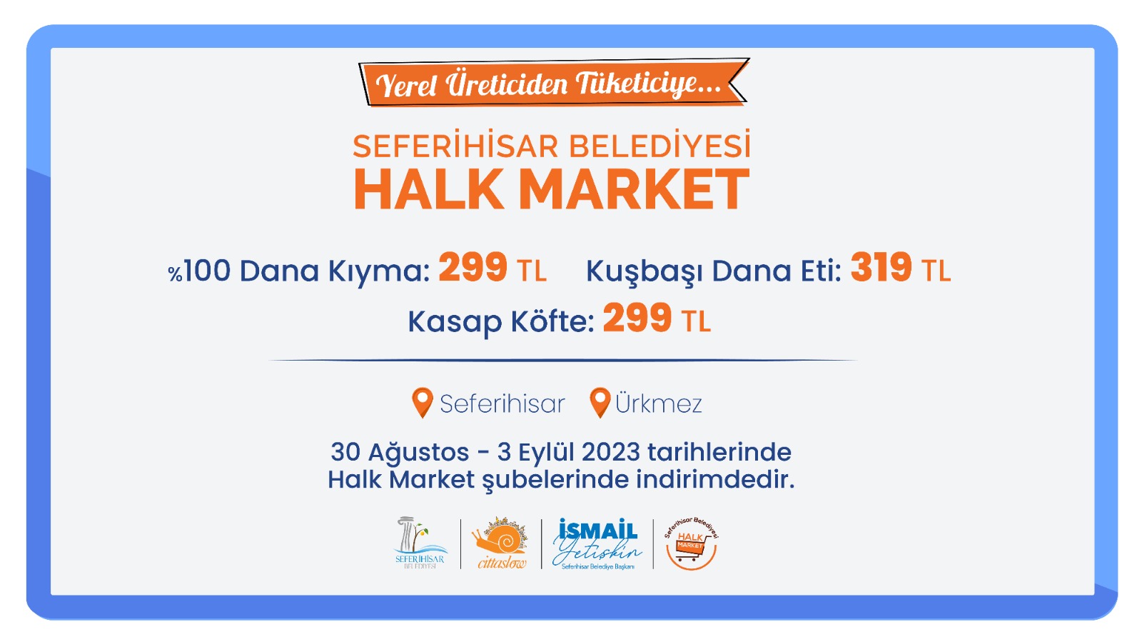 Hayat pahalılığı nedeniyle alım gücünün her geçen gün zorlaştığı bugünlerde, Seferihisar Belediyesi Halk Market ile vatandaşların imdadına yetişti. Sosyal belediyecilik hizmetleriyle dikkat çeken belediye yerel üreticiyle tüketiciyi buluşturarak, halka ucuz ürün imkanı sunduğu Halk Market’te kasap reyonunda indirime gitti. 30 Ağustos-3 Eylül tarihleri arasında geçerli olacak indirim kampanyasında dana kıyma ve kasap köfte 299 TL, kuşbaşı dana eti ise 319 TL’den satışa çıkarıldı.Vatandaşlar Seferihisar ve Ürkmez’de bulunan Halk Market şubelerinden alışverişini yapabilecek.