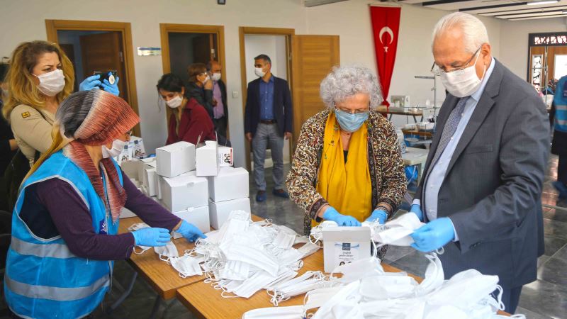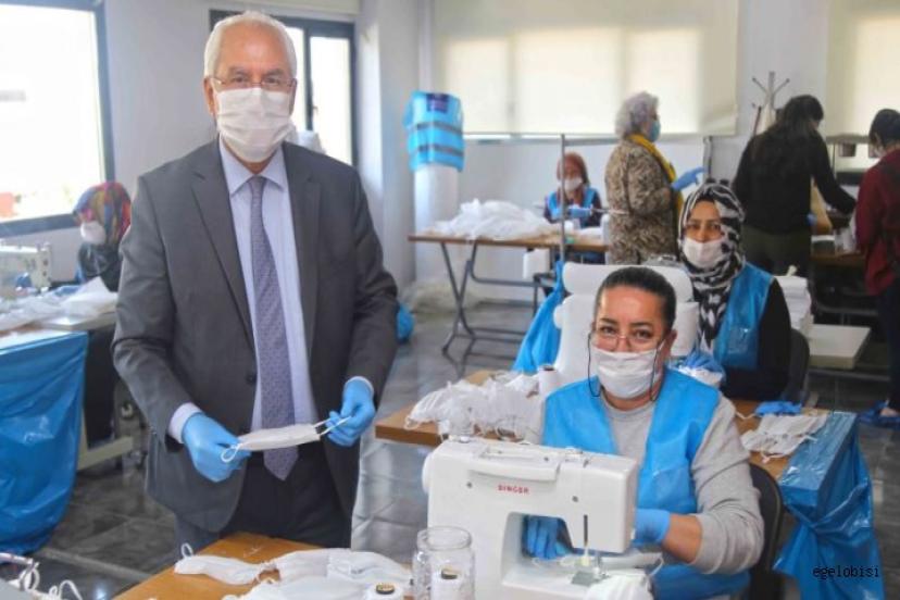 Karabağlar Belediye Başkanı Muhittin Selvitopu, koronavirüs salgınına karşı Barış Semt Merkezi dikiş atölyesinde günde yaklaşık 2 bin 500 maske diken gönüllüleri ziyaret ederek, çalışmalarla ilgili bilgi aldı.