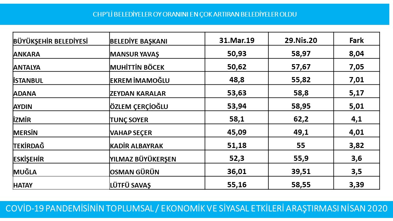 Araştırmaya göre 31 Mart 2019 yerel seçimlerinde yüzde 50,93 oy alarak Ankara Büyükşehir Belediye Başkanlığı'na seçilen Mansur Yavaş'ın 29 Nisan 2020 tarihi itibariyle oyunu yüzde 58,97'ye yükselttiğini ve büyükşehir belediye başkanları arasında yüzde 8,04'le, oyunu en fazla artıran belediye başkanı olduğunu dile getirdi.