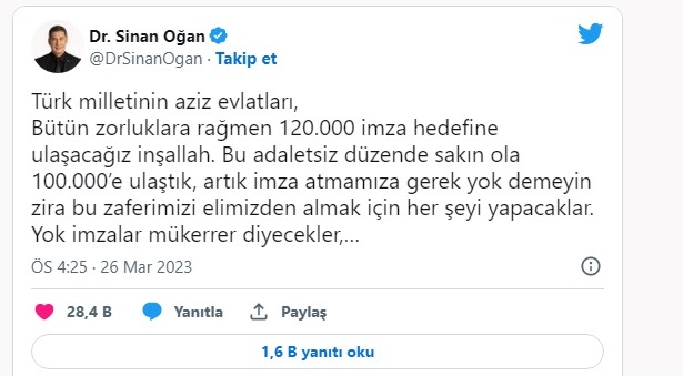 Türk milletinin aziz evlatları, Bütün zorluklara rağmen 120.000 imza hedefine ulaşacağız inşallah. Bu adaletsiz düzende sakın ola 100.000’e ulaştık, artık imza atmamıza gerek yok demeyin zira bu zaferimizi elimizden almak için her şeyi yapacaklar. Yok imzalar mükerrer diyecekler, yok kenarı ıslanmış diyecekler yok bilmem ne diyecekler… O sebeple 120 bin sayısına ulaşana kadar devam edeceğiz.