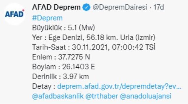 AFAD, Ege Denizi'nde İzmir'in Urla ilçesi açıklarında saat 07.00'da 5,1 büyüklüğünde bir deprem meydana geldiğini duyurdu. Depremin derinliği 3.97 kilometre olarak ölçülürken sarsıntı İzmir ve Manisa'dan da hissedildi. 5,1 büyüklüğündeki depremin ardından Ege Denizi'nde saat 07.09'da 4,3 büyüklüğünde bir artçı deprem meydana geldi.