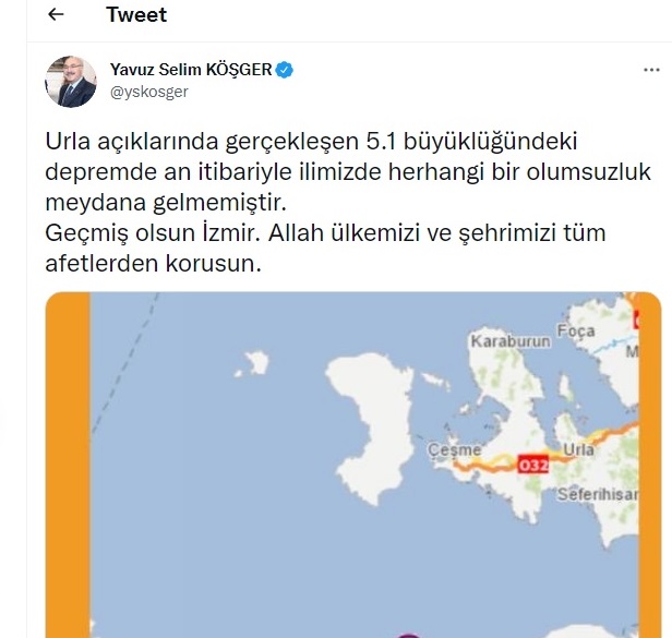 İzmir Valisi Yavuz Selim Köşger, Urla açıklarında gerçekleşen 5,1 büyüklüğündeki depremde kentte herhangi bir olumsuzluk meydana gelmediğini bildirdi.