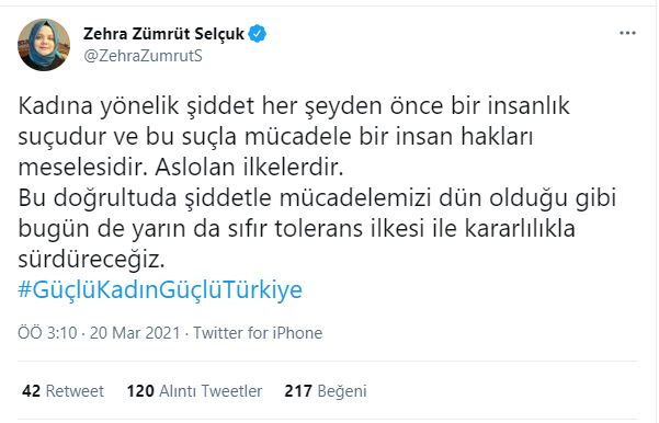 Aile, Çalışma ve Sosyal Hizmetler Bakanı Zehra Zümrüt Selçuk, kadın haklarının teminatının anayasa başta olmak üzere iç mevzuattaki düzenlemeler olduğunu belirterek, "Kadına yönelik şiddet her şeyden önce bir insanlık suçudur ve bu suçla mücadele bir insan hakları meselesidir. Aslolan ilkelerdir. Bu doğrultuda şiddetle mücadelemizi dün olduğu gibi bugün de yarın da 'sıfır tolerans' ilkesi ile kararlılıkla sürdüreceğiz." ifadelerini kullandı.