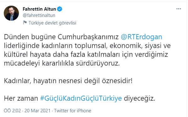 Cumhurbaşkanlığı İletişim Başkanı Fahrettin Altun, sosyal medya hesabından, Türkiye'nin İstanbul Sözleşmesi'nden çekilmesine ilişkin açıklamasında, "Dünden bugüne Cumhurbaşkanımız Recep Tayyip Erdoğan liderliğinde kadınların toplumsal, ekonomik, siyasi ve kültürel hayata daha fazla katılmaları için verdiğimiz mücadeleyi kararlılıkla sürdürüyoruz." ifadesini kullandı.