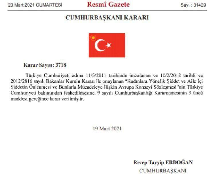 "Türkiye Cumhuriyeti adına 11/5/2011 tarihinde imzalanan ve 10/2/2012 tarihli ve 2012/2816 sayılı Bakanlar Kurulu Kararı ile onaylanan Kadınlara Yönelik Şiddet ve Aile İçi Şiddetin Önlenmesi ve Bunlarla Mücadeleye İlişkin Avrupa Konseyi Sözleşmesi'nin Türkiye Cumhuriyeti bakımından feshedilmesine, 9 sayılı Cumhurbaşkanlığı Kararnamesinin 3'üncü maddesi gereğince karar verilmiştir."