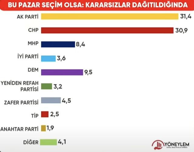 "Kararsızların yaklaşık dörtte birinin yakın hissettiği AKP, beşte birinin yakın hissettiği parti de CHP. Yani şu anda arada inanılmaz büyük bir uçurum yok. Bunları oransal olarak dağıtsak da yakın hissettiği partiye göre dağıtsak da aslında iki partinin oy oranları kafa kafaya gelmiş görünüyor. Türkiye siyasetinde gördüğümüz genel kutuplaşma halinin yani iktidarı destekleyenler ve iktidarın karşısındakiler şeklindeki ikiye bölünmüşlüğün devam ettiğini görüyorum."