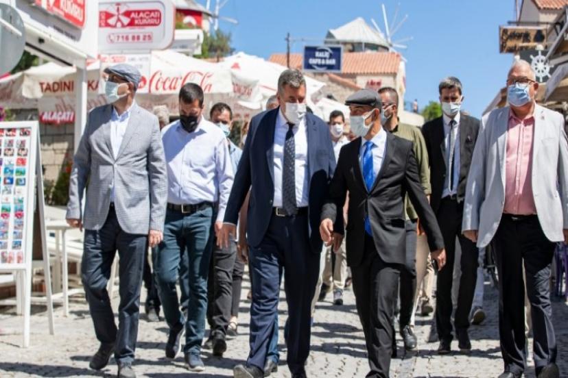 İzmir Büyükşehir Belediye Başkanı Tunç Soyer bugün dünyaca ünlü turizm lokasyonlarından Çeşme'deydi. Başkan Soyer ve Çeşme Belediye Başkanı Ekrem Oran pandemiyle mücadele kapsamında işletmeleri uzun süredir kapalı olan ve normalleşmeyle birlikte yeniden hizmet vermeye başlayan esnafı ziyaret etti.