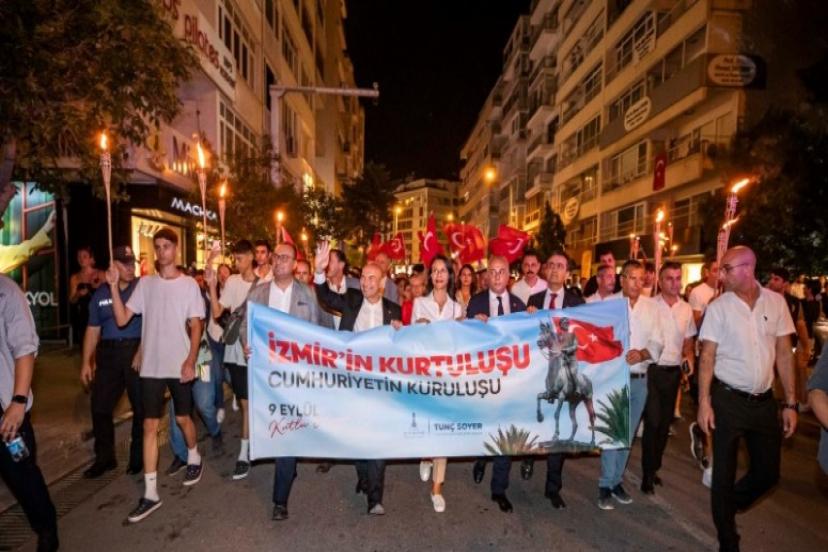 İzmir'in kurtuluşunun 101. yıldönümü bu yıl da coşkulu kutlamalara sahne oldu. İzmir Büyükşehir Belediyesi'nin ev sahipliğinde düzenlenen etkinlikler, tüm gün devam etti. Program kapsamında düzenlenen Fener Alayı yürüyüşüne; İzmir Büyükşehir Belediye Başkanı Tunç Soyer, Konak Belediye Başkanı Abdül Batur, CHP İzmir İl Başkan Vekili Münir Sirhan Özen, siyasi parti temsilcileri, bürokratlar ve İzmirliler katıldı. İzmir Büyükşehir Belediyesi Bandosu eşliğinde saat 20.15'te Cumhuriyet Meydanı'ndan başlayan yürüyüş sırasında İzmirliler, ellerindeki Türk bayraklarıyla Lozan Meydanı'na kadar yürüdü. Başkan Tunç Soyer, balkonlarda ve kortejin dışında coşkuya ortak olan yurttaşları selamladı.