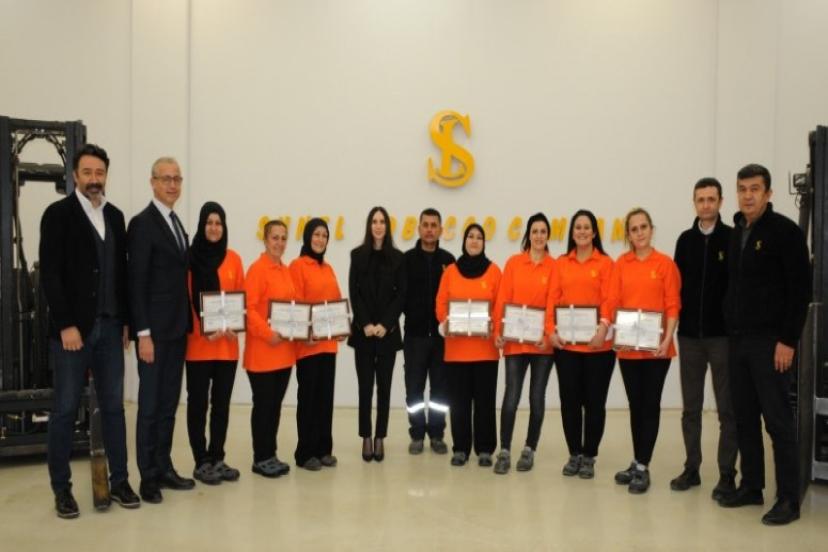 Forklift operatörü olma yolundaki tüm aşamaları başarıyla tamamlayan 7 kadın çalışan düzenlenen törenle sertifikalarını Sunel A.Ş. Yönetim Kurulu Üyesi Mahru Gürel Ağdanlı’nın elinden aldı. Sunel bünyesinde kadın istihdam oranın yüzde 73 olduğunu söyleyen Ağdanlı, bu projeyle birlikte forklift operasyonu gerektiren bölümlerde de kadın çalışanların aktif rol oynamasını hedeflediklerini dile getirdi.