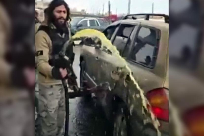 Suriye ordusuna bağlı askerlerin ele geçirilen bölgelerde araçlarının deposuna mazot doldurduğu anlar, sosyal medyada kısa sürede en çok paylaşılan görüntüler arasına girdi.