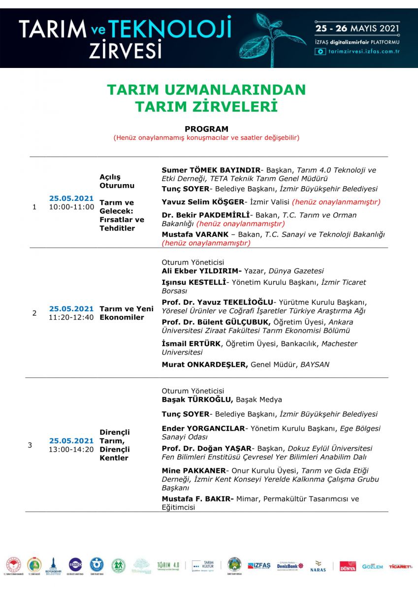 Zirve Oturumları: 25.05.2021 1. Oturum : 10.00 Açılış- Tarım ve Gelecek: Fırsatlar ve Tehditler 2. Oturum : 11.20 Tarım ve Yeni Ekonomiler 3. Oturum: 13.00 Dirençli Tarım, Dirençli Kentler 4. Oturum : 14.40 Fark Yaratanlar : Sürdürülebilir Teknoloji Tarıma Örnekler 5. Oturum : 16.30 Tarım ve Gıda Arz Zincirlerinde Değişen Dinamikler ve E-ticaret 26.05.2021 6. Oturum : 12.00 Tarımda İşbirliği Modelleri: Tarım Bakanlığı, Yerel Yönetimler, Özel Sektör, STK’lar ve Üniversiteler 7. Oturum: 14.00 Tarımda Dijital Dönüşüm 8. Oturum: 16.00 Girişimcilik, Tarım Filizleri Yatırım Ağı ve Hızlandırıcı Programları 9. Oturum: 17.40 Kapanış-Zirve sonuç ve yol haritası bildirgesinin paylaşımı Zirve, İZFAŞ'in digitalizmirfair platformu tarimzirvesi.izfas.com.tr üzerinden izlenebilir ve kayıtlar www.tarimzirveleri.com web sitesinden yapılabilir.