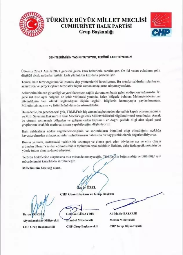 Kuzey Irak'taki Pençe-Kilit harekat bölgesinde terör örgütleri tarafından düzenlenen hain saldırıda 12 askerimizin şehit olmasının ardından Türkiye Büyük Millet Meclisi'nde (TBMM), AK Parti, MHP, İYİ Parti ve Saadet Partisinin imzaladığı bildiri yayınlandı. PKK terör örgütünün saldırılarının "Terör ve şiddet hiçbir zaman hedefine ulaşamayacaktır" sözleriyle kınandığı bildiriye CHP ve DEM (HDP) partileri imza atmadı.