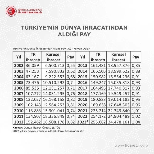 "Dünya Ticaret Örgütü istatistiklerine göre 2021 yılında dünya ihracatı 22,3 trilyon dolar olarak gerçekleşmiş olup Türkiye'nin ihracatı bu dönemde 225,2 milyar dolar seviyesinde gerçekleşerek dünya ihracatı içerisindeki pay tarihinde ilk defa %1 seviyesinin üzerine çıkmıştır. Böylelikle ihracatımızın dünya ihracatı içerisindeki payı %1,01 seviyesine yükselmiştir.
