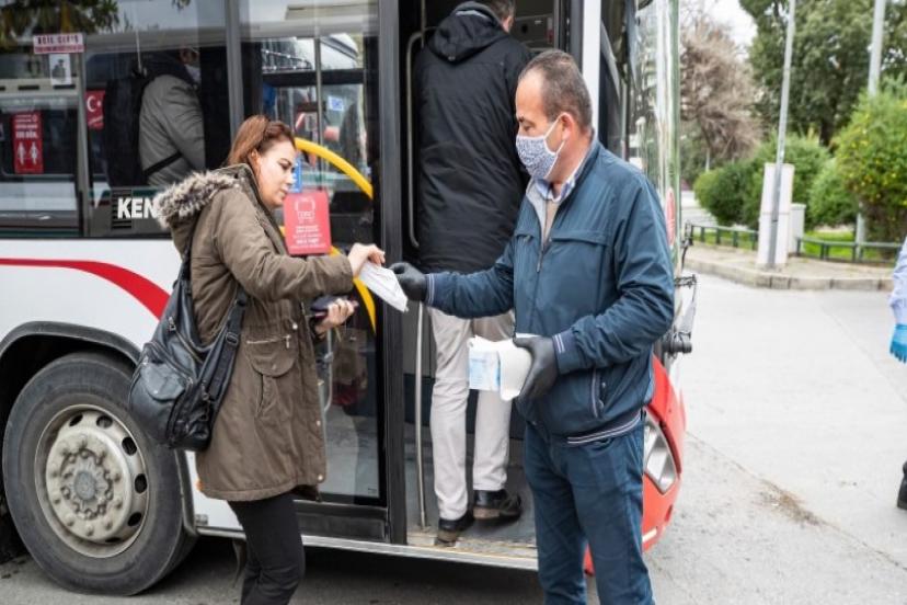 İzmir Büyükşehir Belediyesi otobüs, metro, tramvay ve gemi yolcularına aktarma merkezlerinde, istasyonlarda, duraklarda ve iskelelerde ücretsiz maske dağıtmaya başladı.