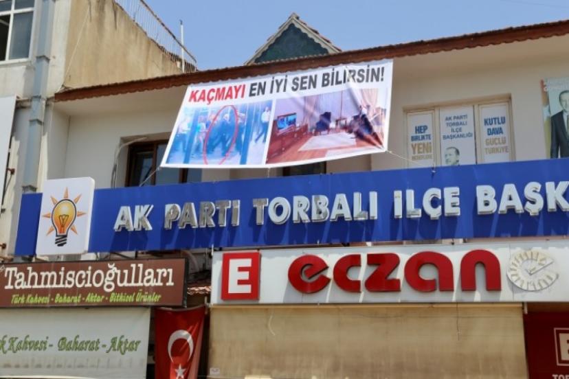 AK Parti Torbalı İlçe binasına asılan pankart üzerinde “Kaçmayı en iyi sen bilirsin” ifadeleri yer aldı. Kılıçdaroğlu’nun 15 Temmuz darbe gecesi havaalanından çıkış görüntülerinin ve darbe girişimini televizyondan izlediği görüntülerin yer aldığı pankart, ilçe halkı tarafından da büyük destek gördü.