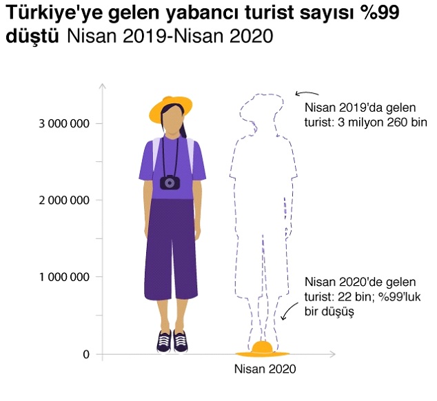 Türkiye İstatistik Kurumu'nun (TÜİK) yayımladığı son verilere göre, Türkiye'ye gelen yabancı turist sayısı Nisan ayında yüzde 99 düşüş kaydetti.Yılın birinci çeyreğinde, turizm gelirleri de 2019'un aynı dönemine göre, yüzde 11,4 azalarak, 4,1 milyar dolara geriledi.Turizm sektöründe görülen küçülmenin en temel nedenini koronavirüs salgını nedeniyle getirilen kısıtlamalar oluşturuyor.