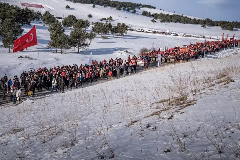 Ellerinde Türk bayrakları bulunan binlerce kişi, burada Kur'an-ı Kerim okuyup tekbir ve salavatlar getirerek şehitler için dua ettikten sonra soğuk havada Ay-Yıldızlı Tören Alanı'na doğru yürüyüşe geçti. Katılımcılar, jandarmanın geniş güvenlik önlemi aldığı 4,5 kilometrelik güzergahtaki yürüyüşün ardından ulaşacakları şehitlikte, Kur'an-ı Kerim tilaveti sonrası şehitler için dua edecek.
